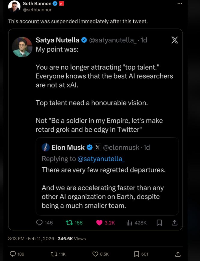 Then the episode got weirder. The X account “satyanutella_,” which had been publicly sparring with Musk over xAI recruiting and retention, is now labeled “Account suspended” on X. You cannot prove from the outside who pushed the button or why, but the optics are brutal: Musk argues about talent flight on his own platform, and the critic disappears from the platform. Even if it was a rules enforcement action, it reads like a warning to anyone thinking of making the retention conversation louder.
